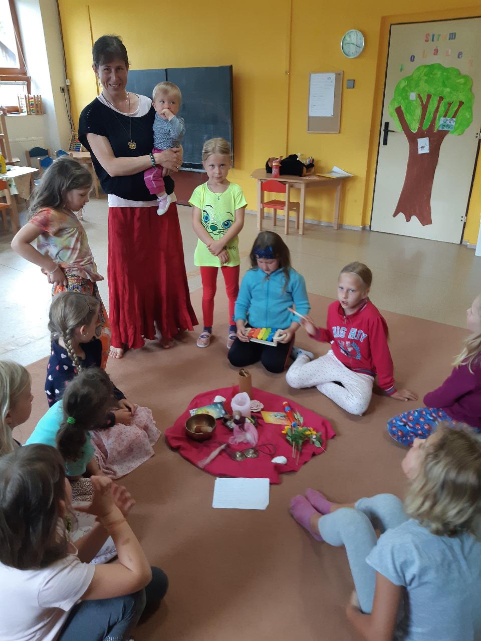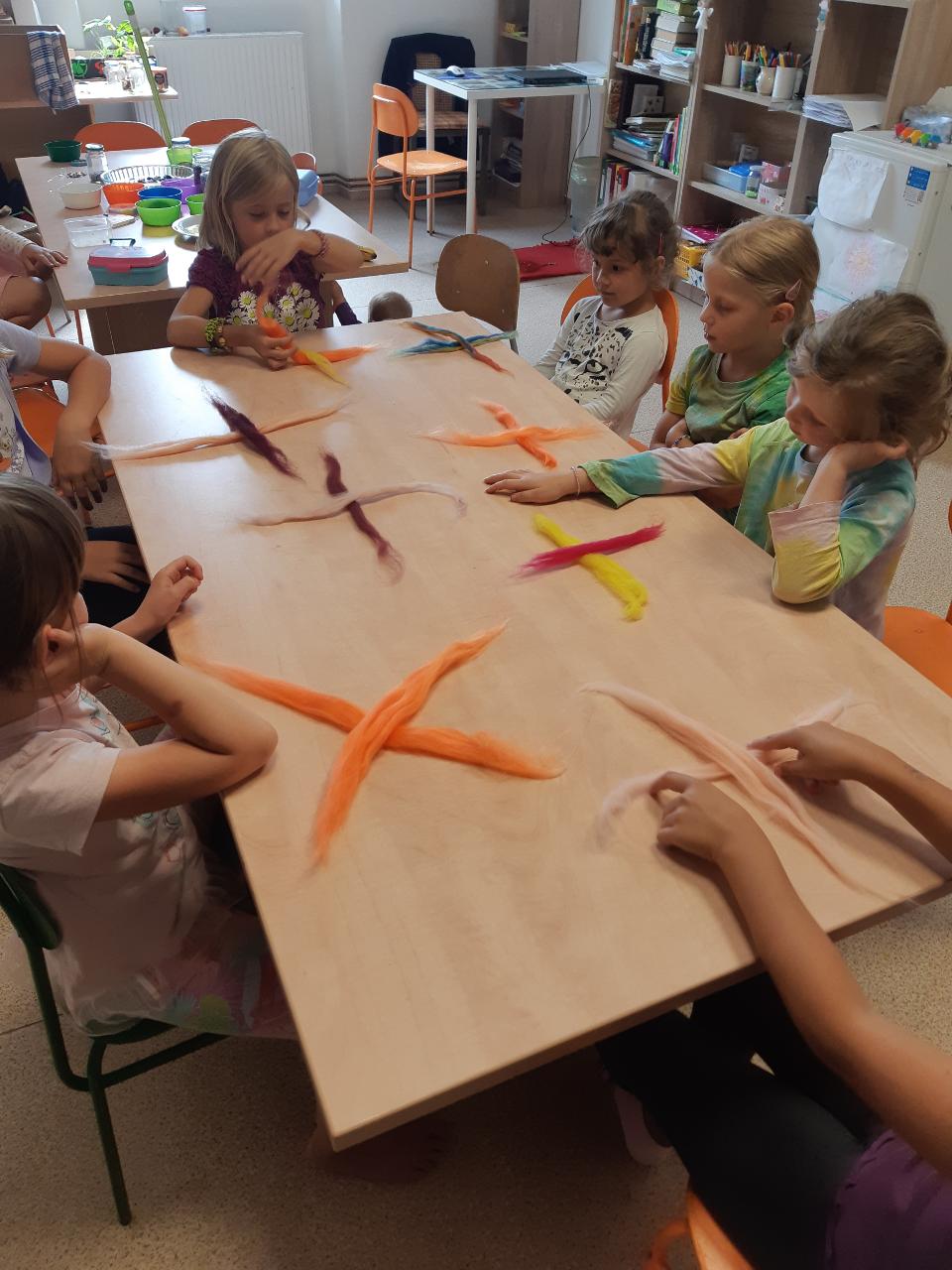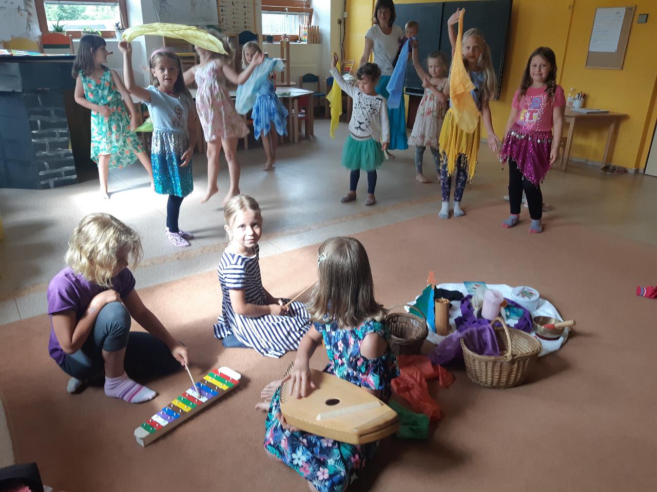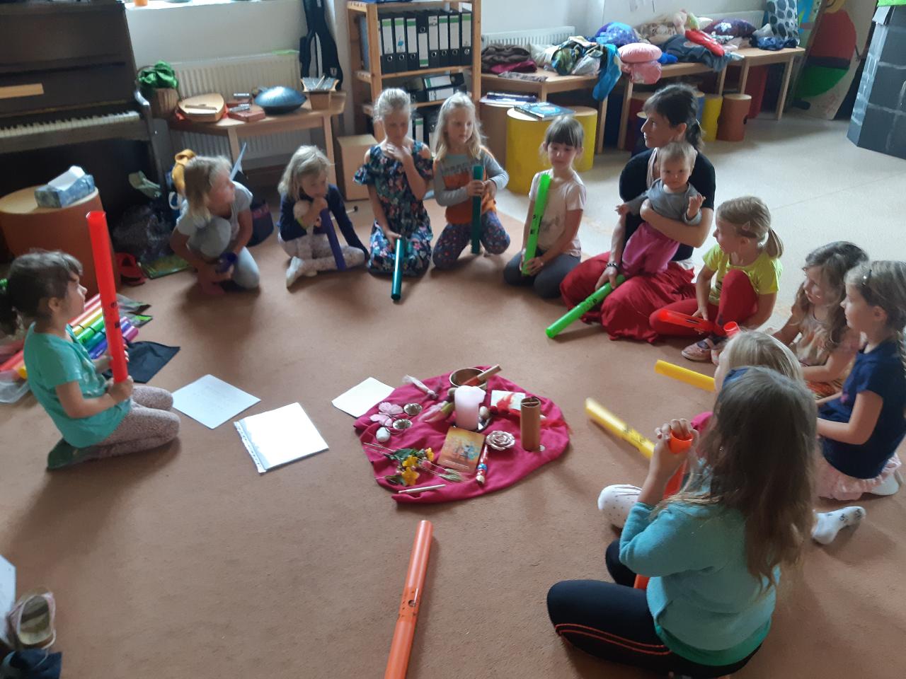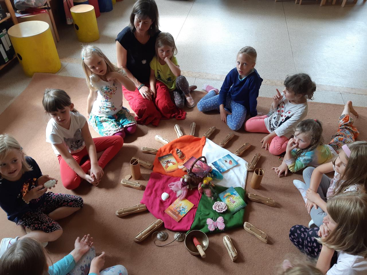 Na tomto týdnu se sešlo 11 dívek ve věku 5-10 let. Užili jsme si spoustu tvoření, malování, vyrábění, výletů i her. Tvořili jsme náramky z korálků, andílky (pardon, vlastně víly) z ovčí vlny, vyráběli jsme lapače snů, malovali roční období a jejich symboly. Svá těla jsme protáhli při jógových cvičeních a zjišťovali, zda se nám lépe a snáz cvičí samostatně nebo ve dvojici. Bubnovali jsme a tančili, zkoumali, jak to máme se strachem a důvěrou. Zkoušeli jsme vyjádřit naše pocity a emoce nejenom slovy, ale třeba právě hraním na různé hudební nástroje. Hodně času jsme také trávili venku a užívali si společných her na loukách a v lesích v okolí Mraveniště. Při společných aktivitách jsme objevovali, jak je důležitá komunikace a spolupráce a že když udělám radost někomu druhému, o to větší může být i moje vlastní. A stejně jako loni nám na výletech a vycházkách dělala společnost zkušená psí průvodkyně Fidorka, která si to s námi určitě moc užila.