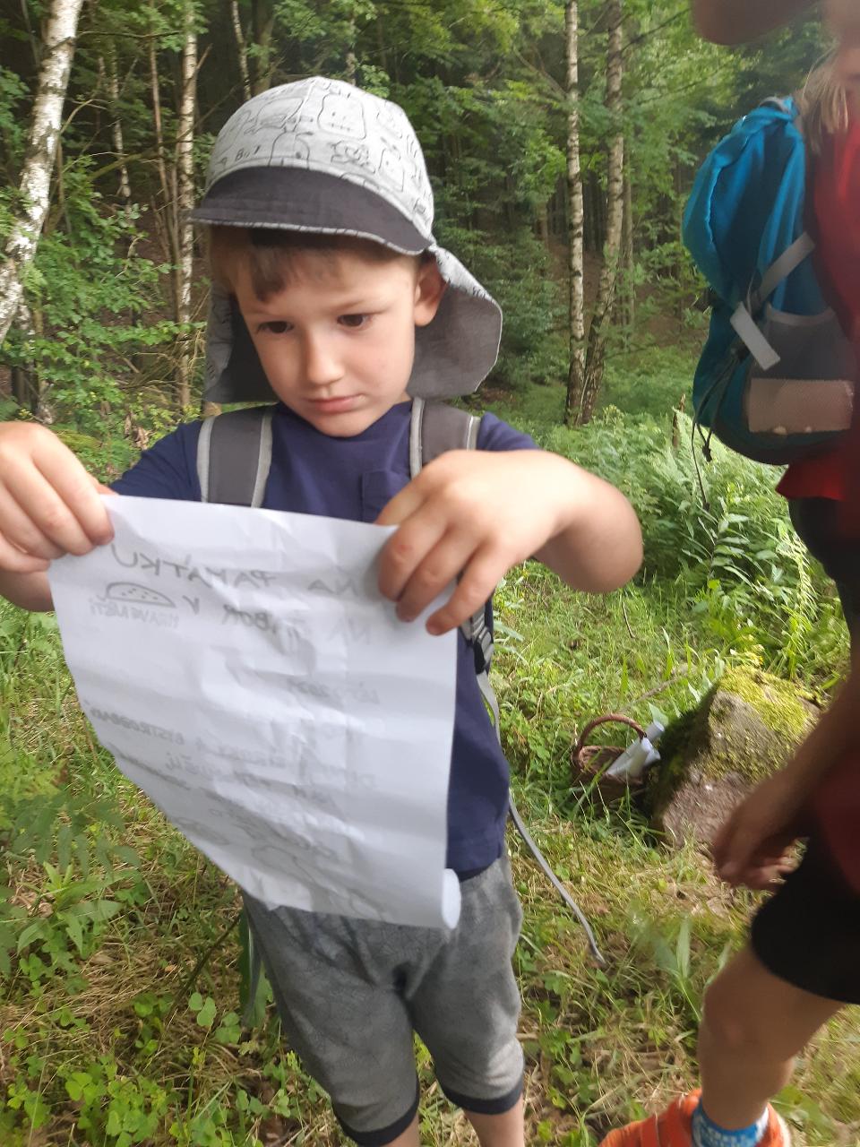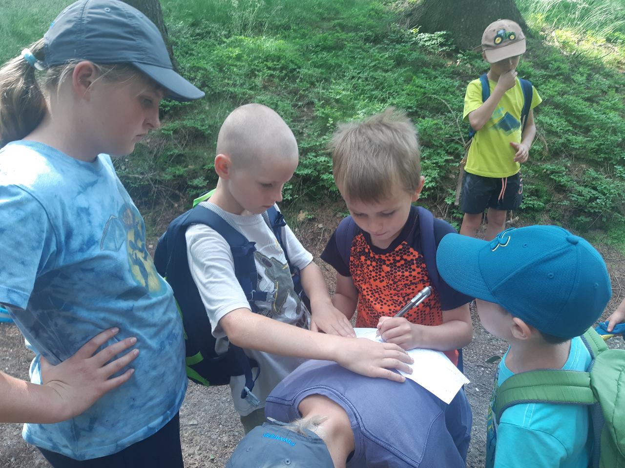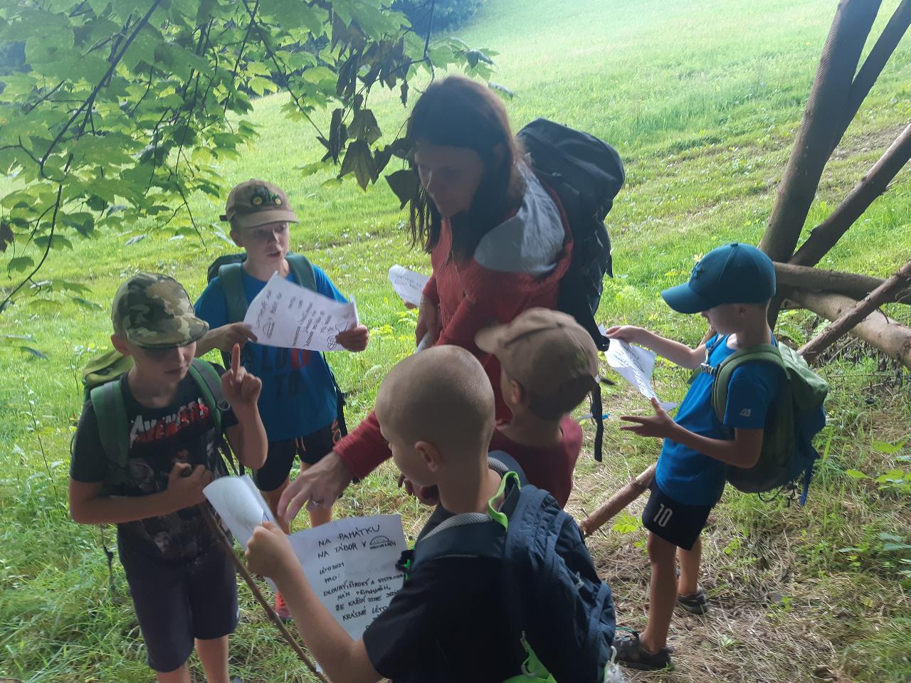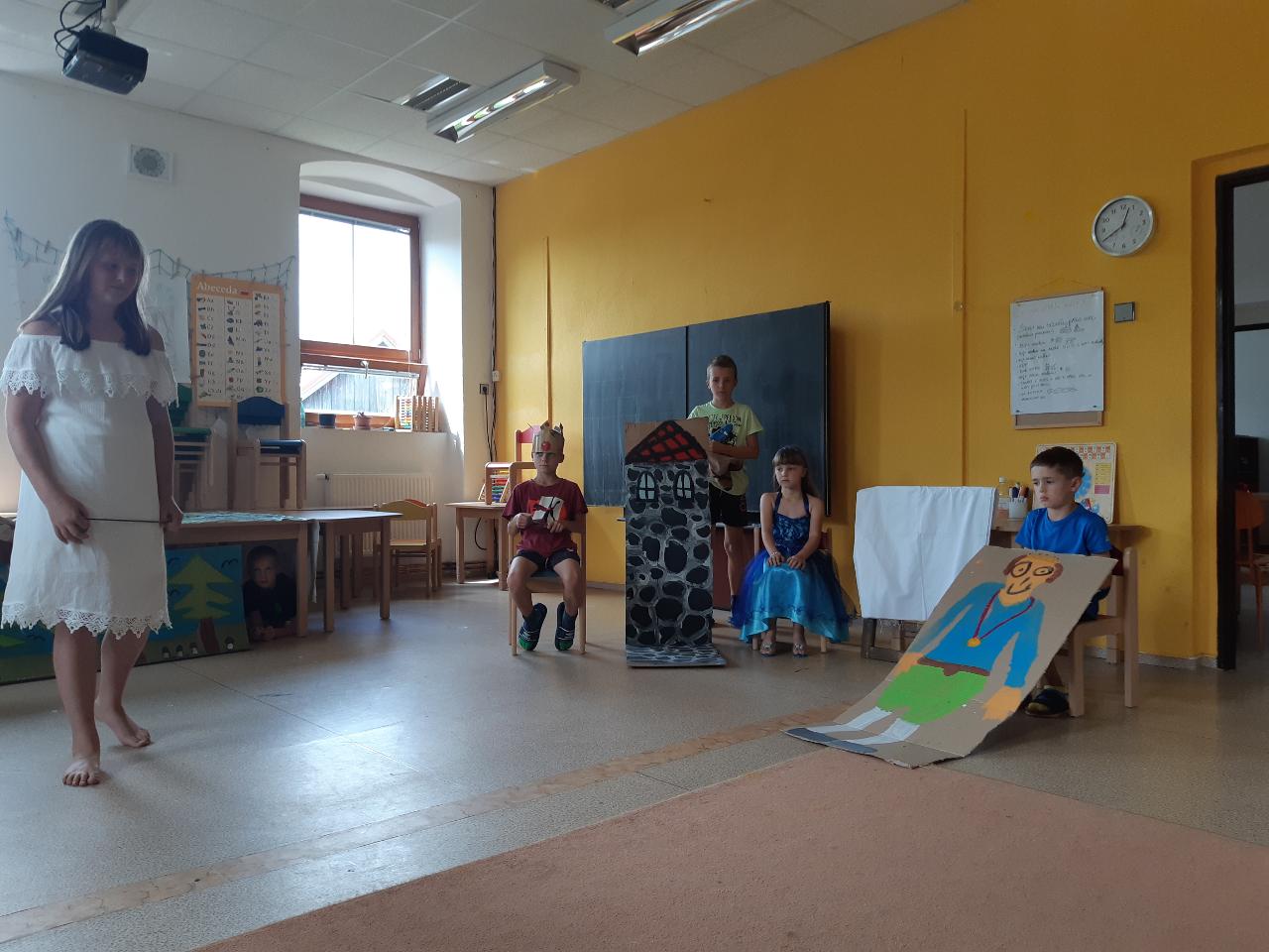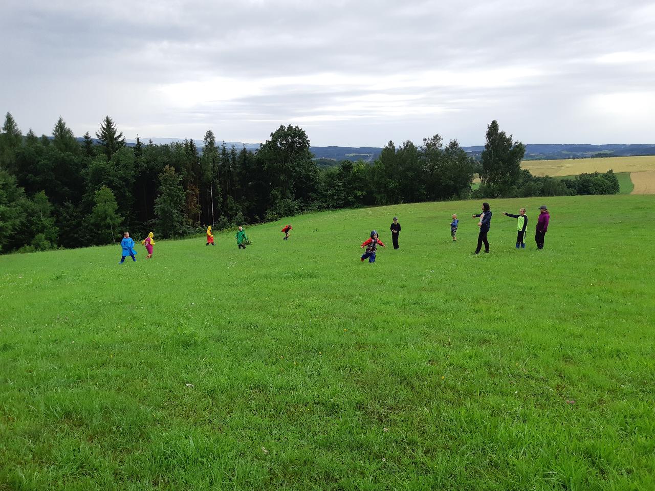 Týdnem s pohádkami nás provázela pohádka o Dlouhém, Širokém a Bystrozrakém, první den jsme si ji přečetli a potom každý den plnili úkoly jako naši hrdinové. Na rozhledně jsme našli princeznu zakletou do žaludu, v jeskyni v lese do drahokamu a v potoce do prstýnku. V pátek jsme pohádku zahráli jako divadlo pro děti ze školky, kulisy a kostýmy si děti vyrobily samy. Červencové počasí nám nabídlo všechno, co umí- horký slunečný den i celodenní liják a bouřku, nic nás ale neodradilo od poznávání míst v okolí, stromů a rostlinek, ani od her venku. A protože se sešla parta správných dětí 7 kluků a 3 holek dost rozdílného věku, dokázali se vždycky nakonec domluvit, pomoci si navzájem nebo se zastat slabšího kamaráda. Takže to, jak už to v pohádkách bývá, nakonec všechno dobře dopadlo.