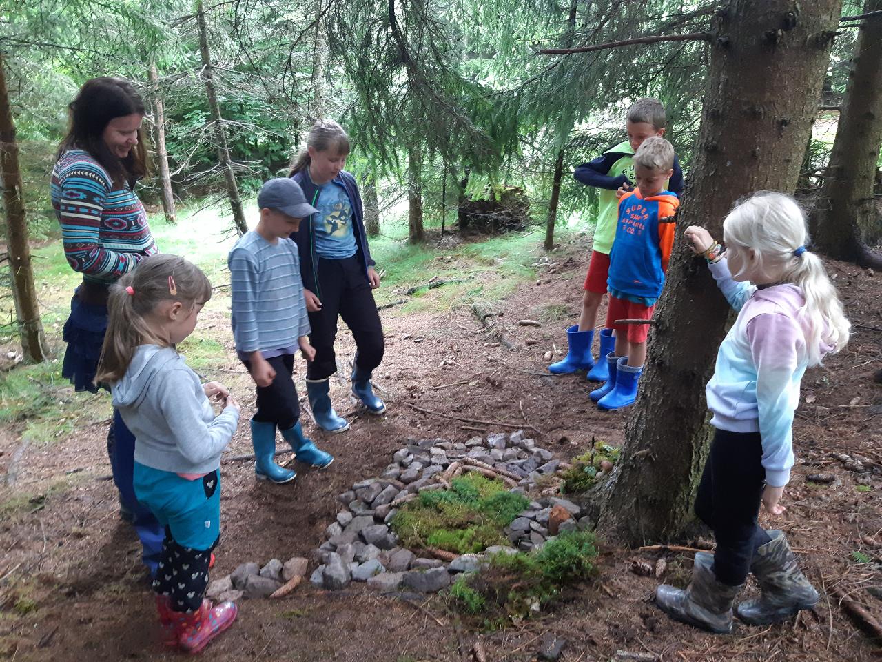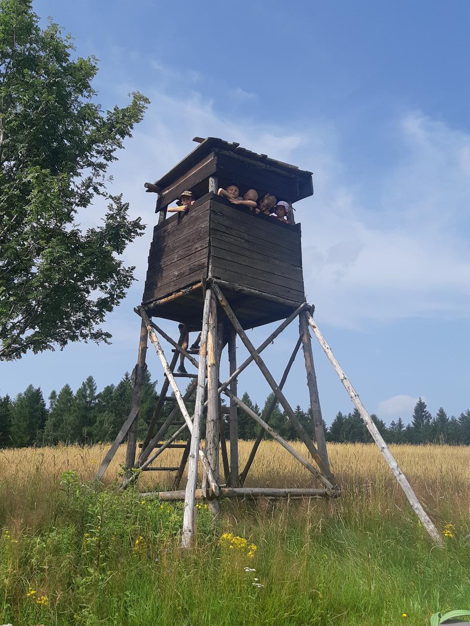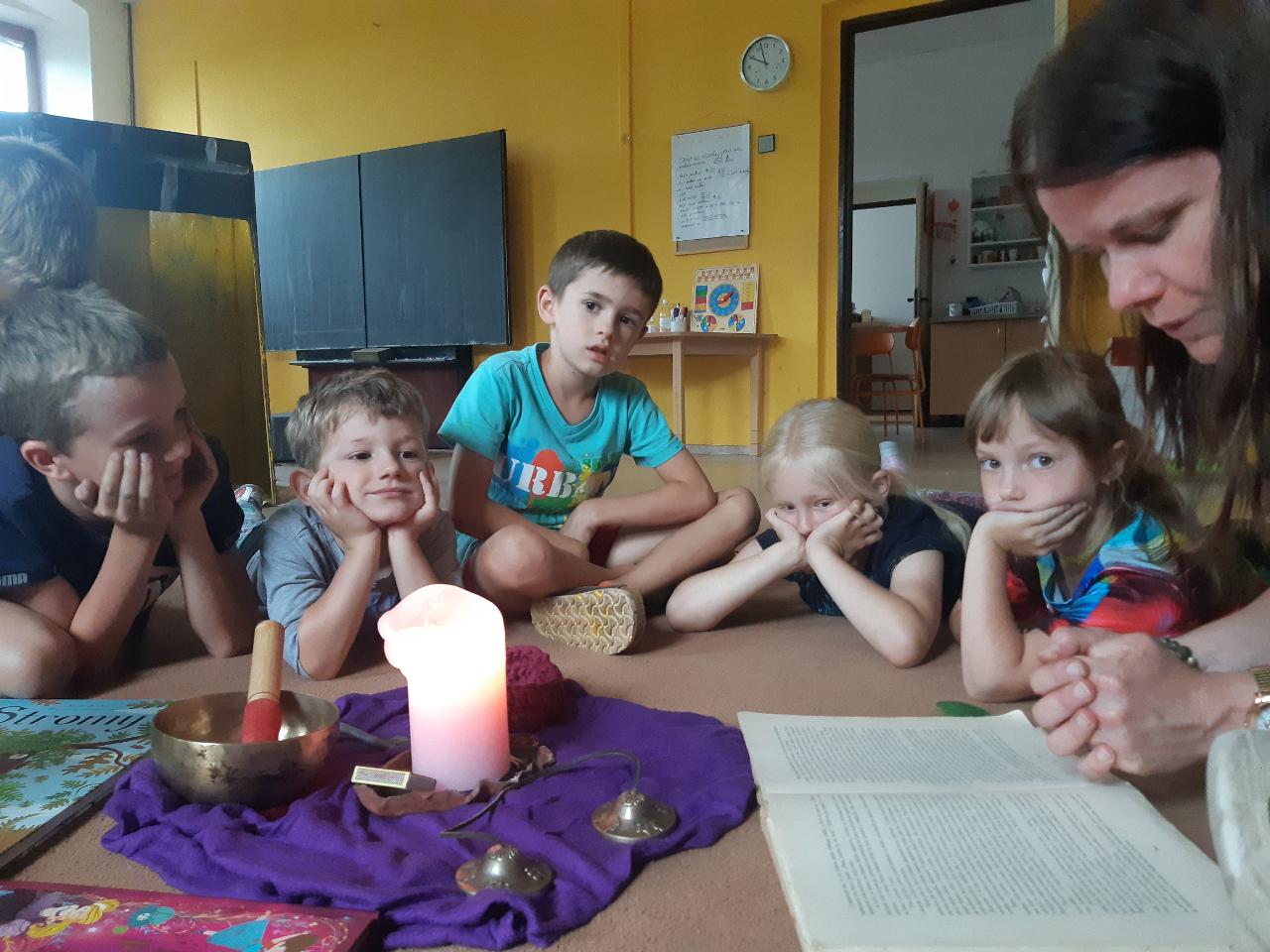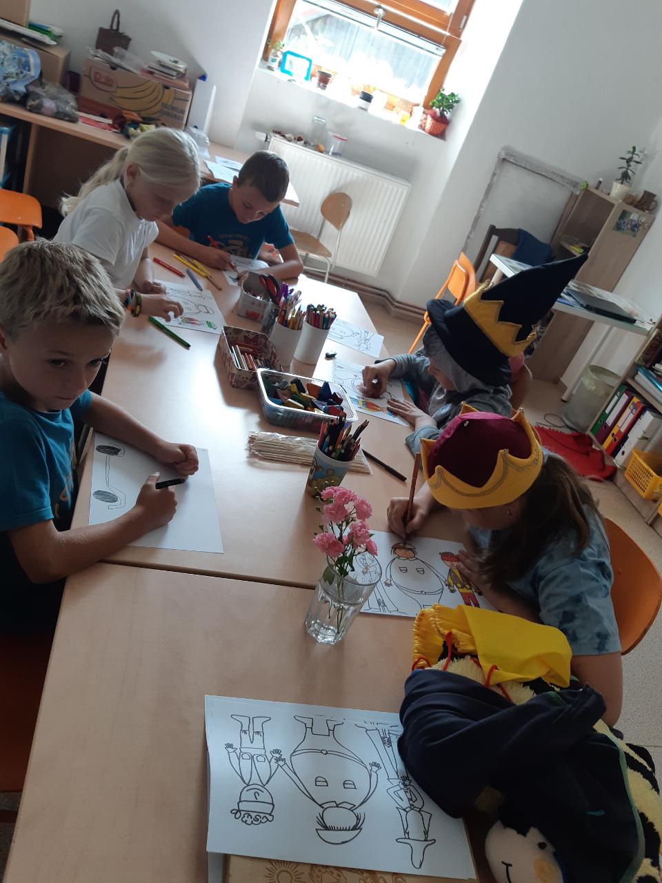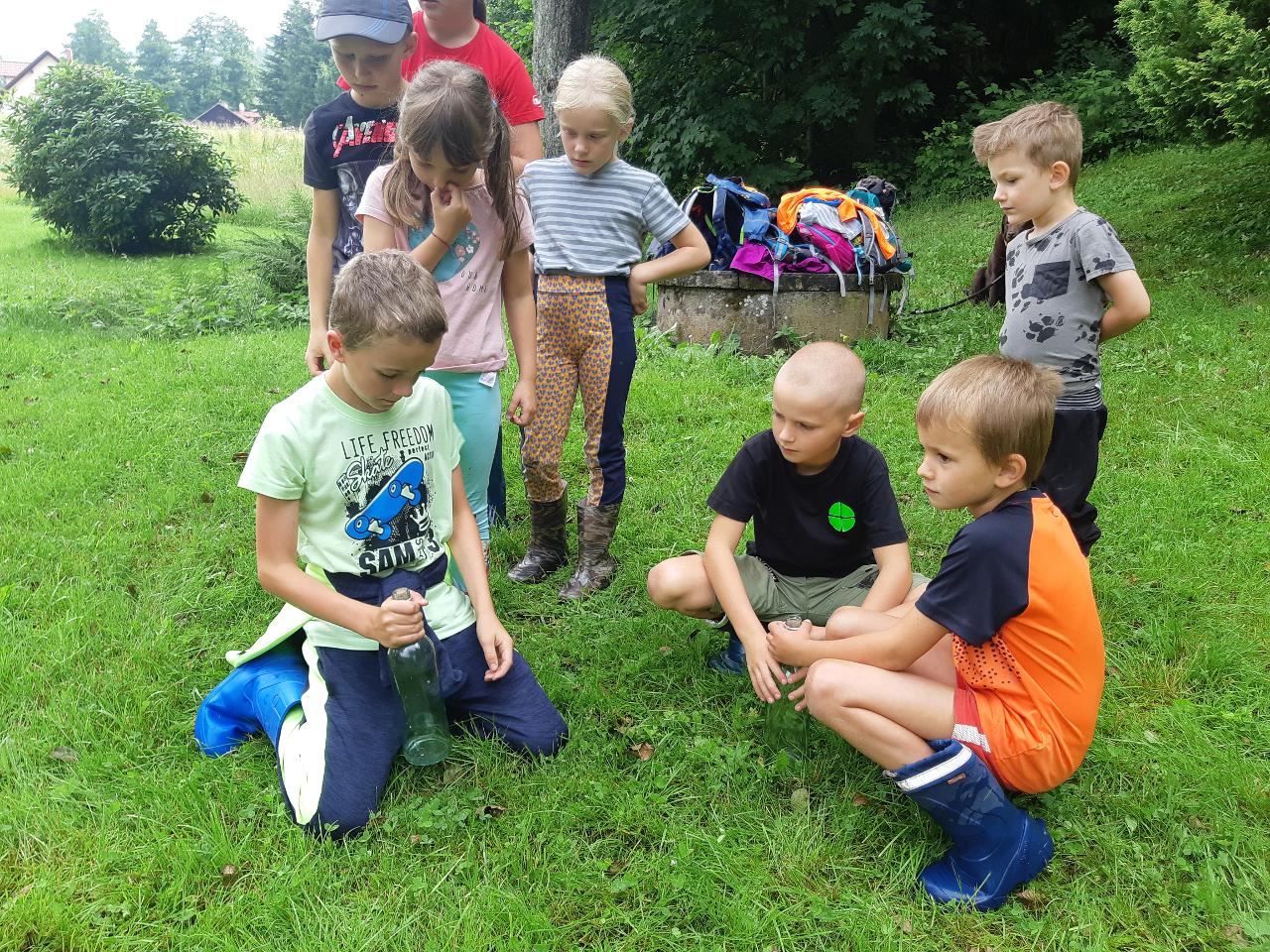 Týdnem s pohádkami nás provázela pohádka o Dlouhém, Širokém a Bystrozrakém, první den jsme si ji přečetli a potom každý den plnili úkoly jako naši hrdinové. Na rozhledně jsme našli princeznu zakletou do žaludu, v jeskyni v lese do drahokamu a v potoce do prstýnku. V pátek jsme pohádku zahráli jako divadlo pro děti ze školky, kulisy a kostýmy si děti vyrobily samy. Červencové počasí nám nabídlo všechno, co umí- horký slunečný den i celodenní liják a bouřku, nic nás ale neodradilo od poznávání míst v okolí, stromů a rostlinek, ani od her venku. A protože se sešla parta správných dětí 7 kluků a 3 holek dost rozdílného věku, dokázali se vždycky nakonec domluvit, pomoci si navzájem nebo se zastat slabšího kamaráda. Takže to, jak už to v pohádkách bývá, nakonec všechno dobře dopadlo.
