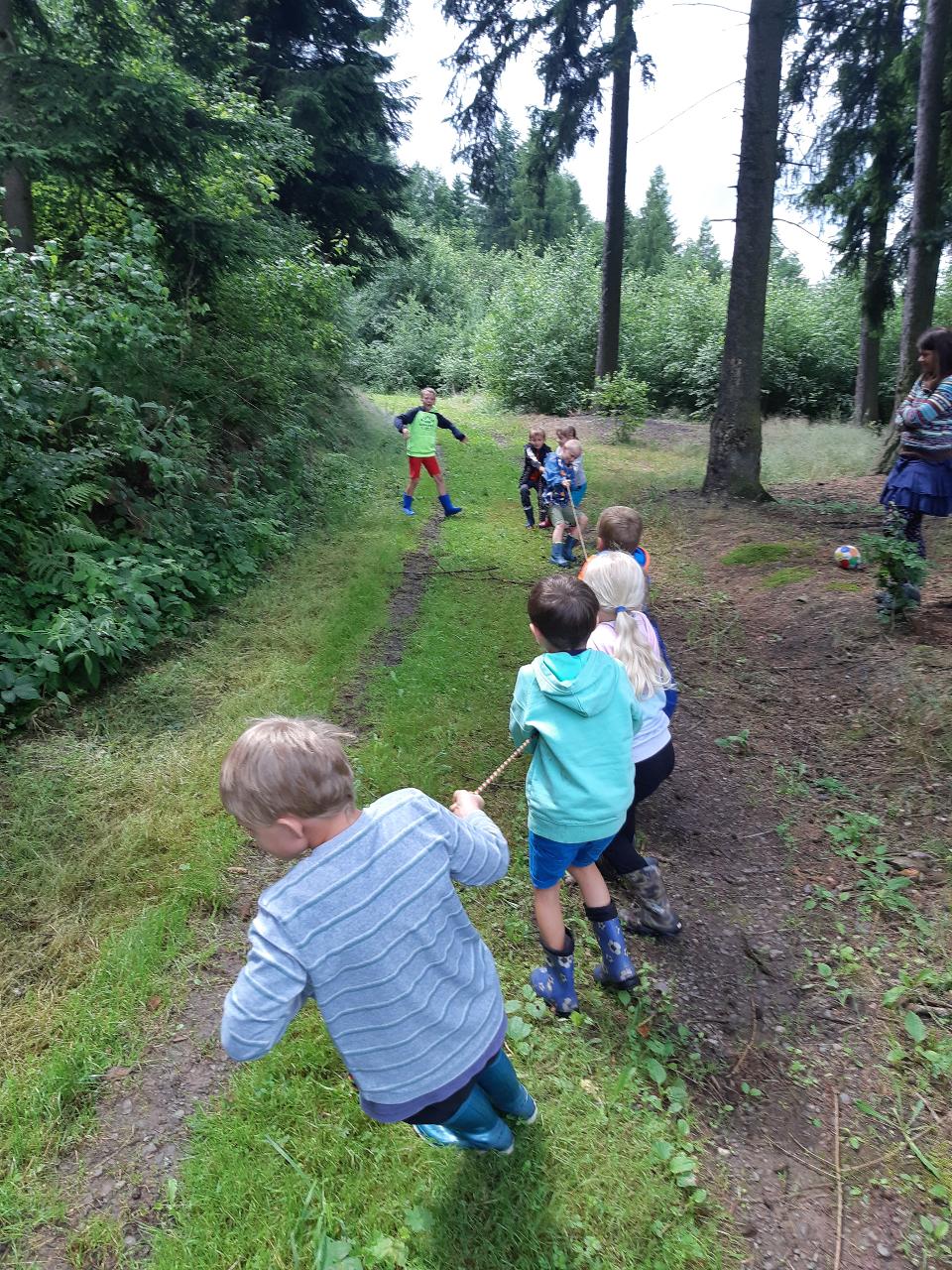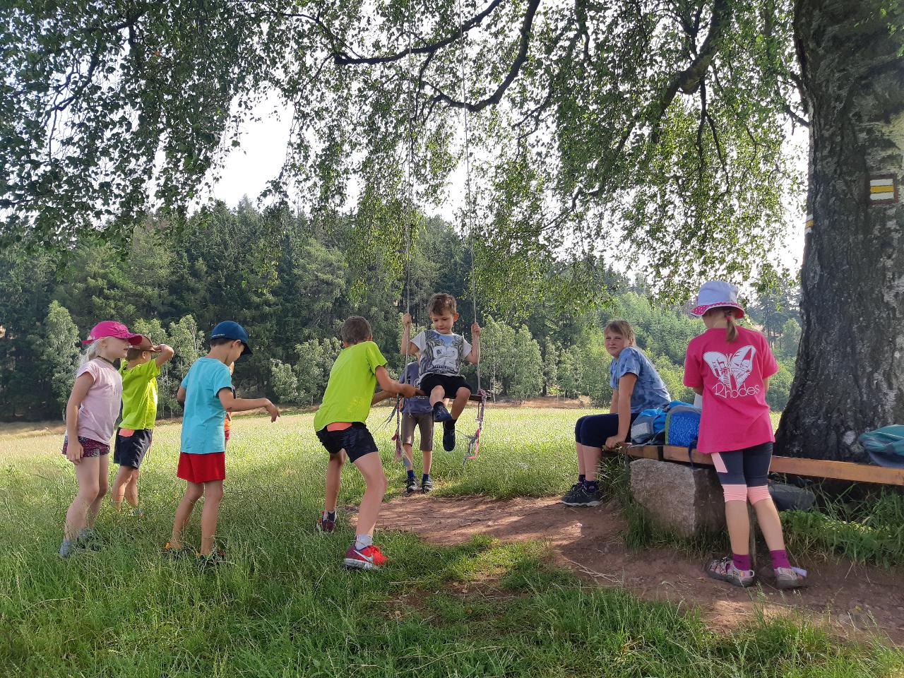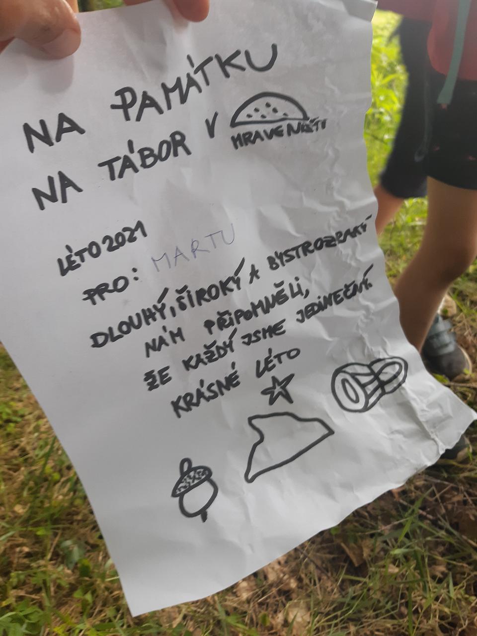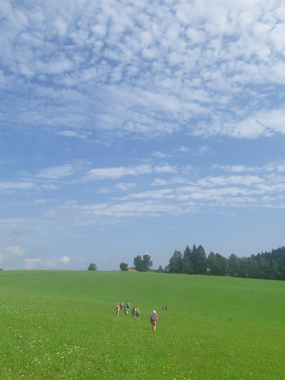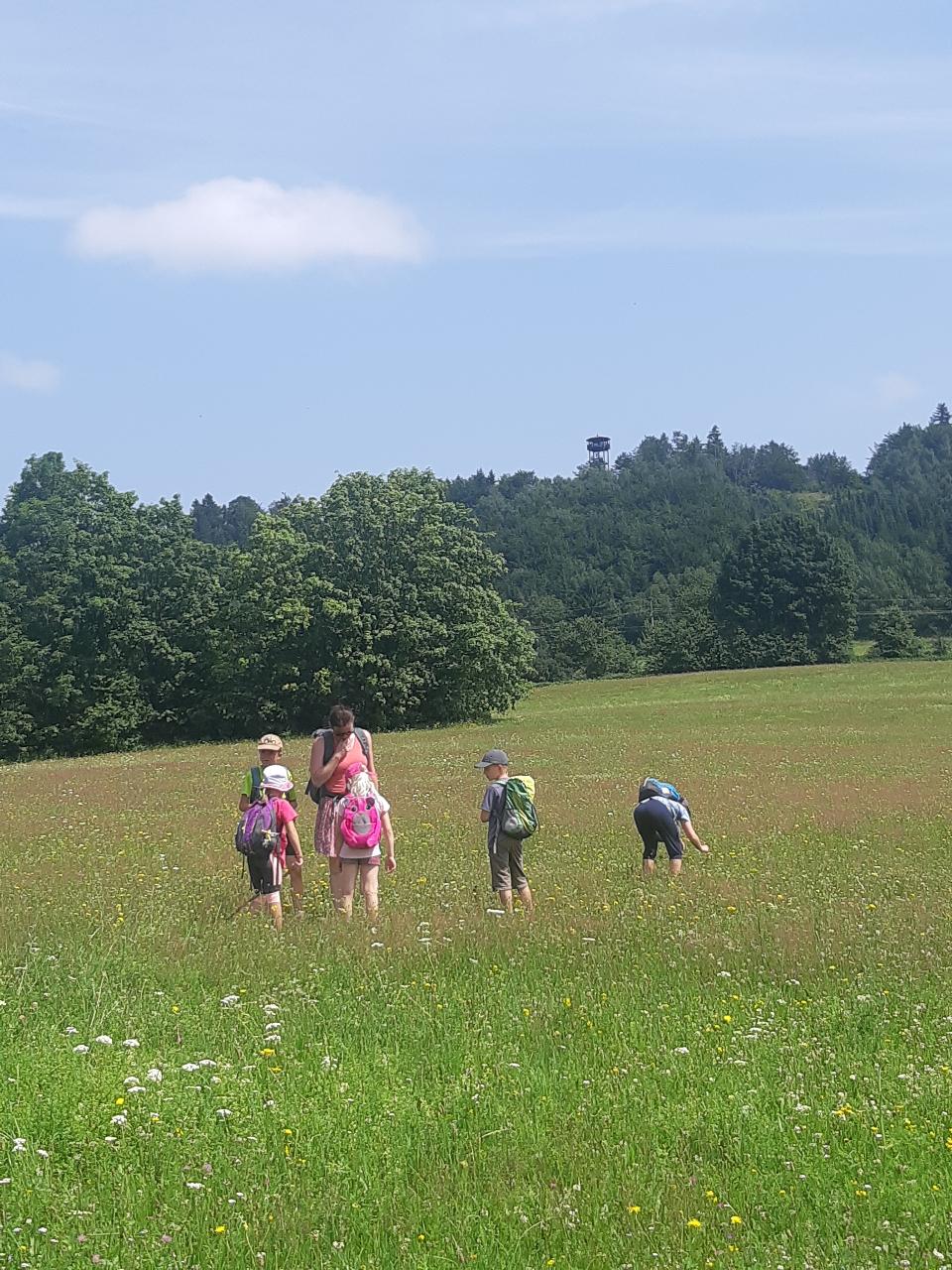 Týdnem s pohádkami nás provázela pohádka o Dlouhém, Širokém a Bystrozrakém, první den jsme si ji přečetli a potom každý den plnili úkoly jako naši hrdinové. Na rozhledně jsme našli princeznu zakletou do žaludu, v jeskyni v lese do drahokamu a v potoce do prstýnku. V pátek jsme pohádku zahráli jako divadlo pro děti ze školky, kulisy a kostýmy si děti vyrobily samy. Červencové počasí nám nabídlo všechno, co umí- horký slunečný den i celodenní liják a bouřku, nic nás ale neodradilo od poznávání míst v okolí, stromů a rostlinek, ani od her venku. A protože se sešla parta správných dětí 7 kluků a 3 holek dost rozdílného věku, dokázali se vždycky nakonec domluvit, pomoci si navzájem nebo se zastat slabšího kamaráda. Takže to, jak už to v pohádkách bývá, nakonec všechno dobře dopadlo.