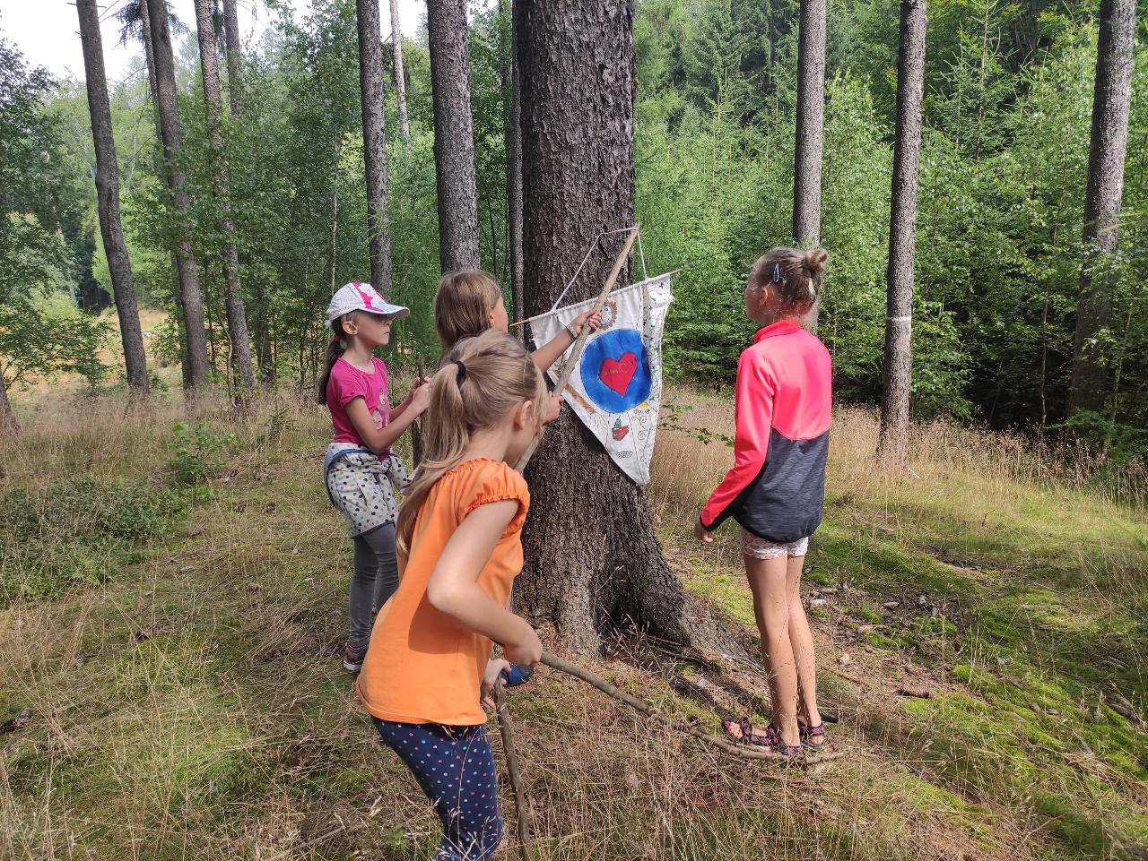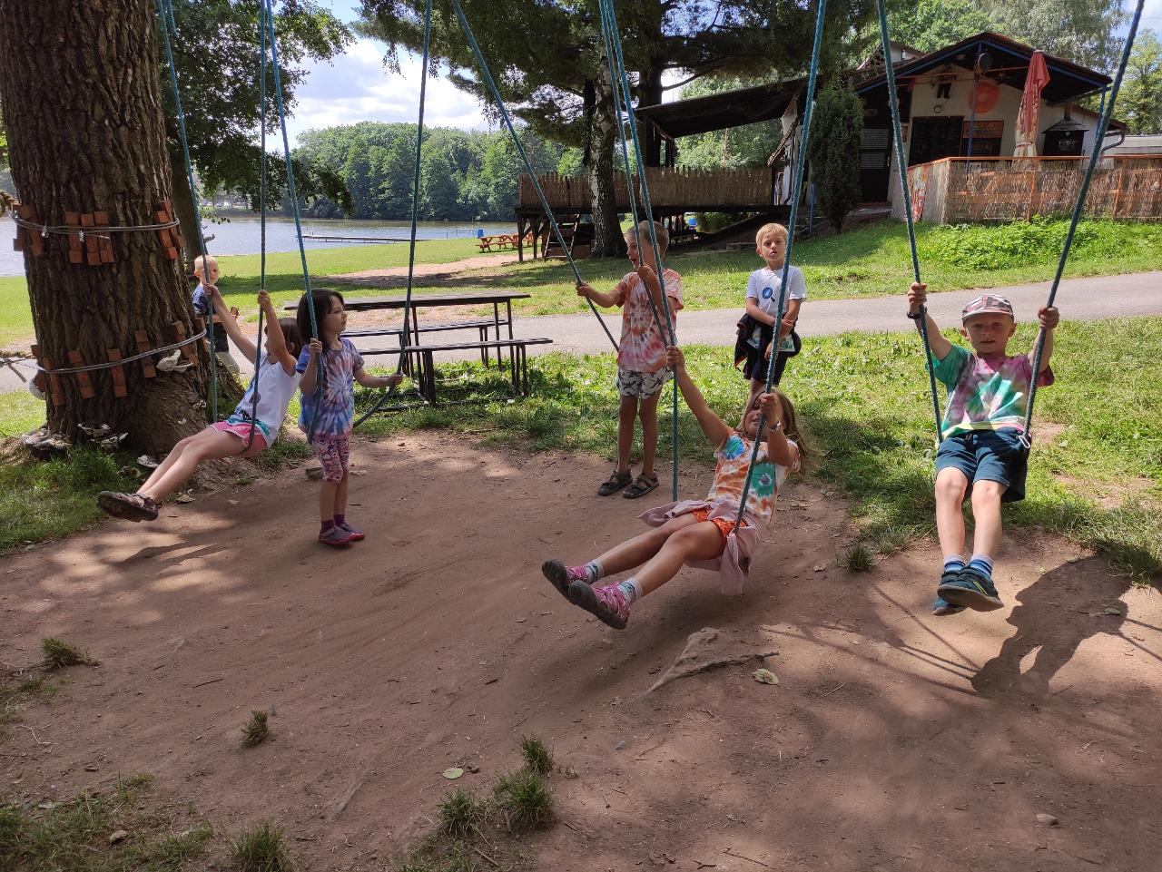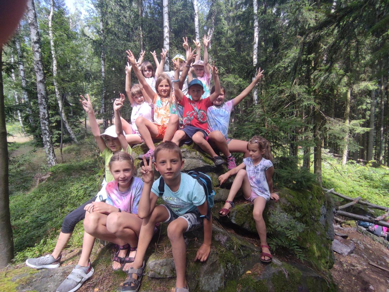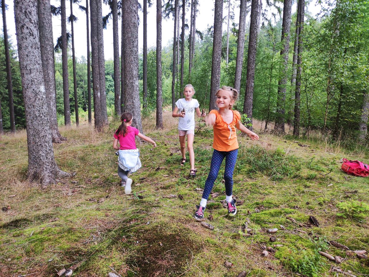 “Vzhůru za dobrodružstvím” bylo téma, které nás doprovázelo celým týdnem. Sešla se bezvadná parta menších i větších človíčků. První den jsme se vydali k bříze. Některým dětem, se zdála cesta málo dobrodružná. Tak jsme to zkusili se zavázanýma očima. Každý si dobrodružství představuje jinak, v naší partě to bylo lezení po skalách, překonávání překážek nebo strachu, či hledání pokladu. Druhý den jsme si vyrobili vlajky a vydali jsme se k hadímu kopečku, kde se strhla velká bitva o vlajku. Šišky létaly vzduchem, vymýšlely se různé strategie a životy v podobě čárek na ruce postupně mizely. Ve středu nás pohltilo barvení a malování triček. Radost z nich byla obrovská.Sluníčko nám přálo tak jsme se po obědě vrhli do nedalekého bazénu. Ve čtvrtek nás přivítal Brodský rybník. Tam se dá zažít takových dobrodružství. Proběhnout co nejrychleji opičí dráhu, která vedla většinou vzduchem, nebo namalovat obrázek, který je daleko či hry s vodou i ve vodě. Nesnadné bylo sundat a přidělat kolíček z pavoučí sítě. Odměnou byl sladký nanuk a výborný řízek s chlebem. Děkujeme Liduško. A v pátek to konečně přišlo….u Mraveniště nás čekal vzkaz, že můžeme najít poklad, který je ze všech nejcennější. (V té chvíli jsme nevěděli, že už ho vlastně máme). Bylo nutné splnit devět mnohdy těžkých úkolů. Za každý úkol jsme získali jedno písmenko k pokladu a místo, kde se nachází další úkol. Z písmenek nám pak vzešlo slovo PŘÁTELSTVÍ. Nejprve nás zaskočilo co je to za poklad, ale pak jsme na to přišli. Vždyť největším pokladem je, mít KAMARÁDY. Děkujeme vám za krásný týden naši malí kamarádi. Přátelství s vámi je opravdové a krásné. Připomenou nám to náramky přátelství, které nosíme na ruce. Já ho stále mám a jsem ráda, protože mi vás připomíná. Miri a Market