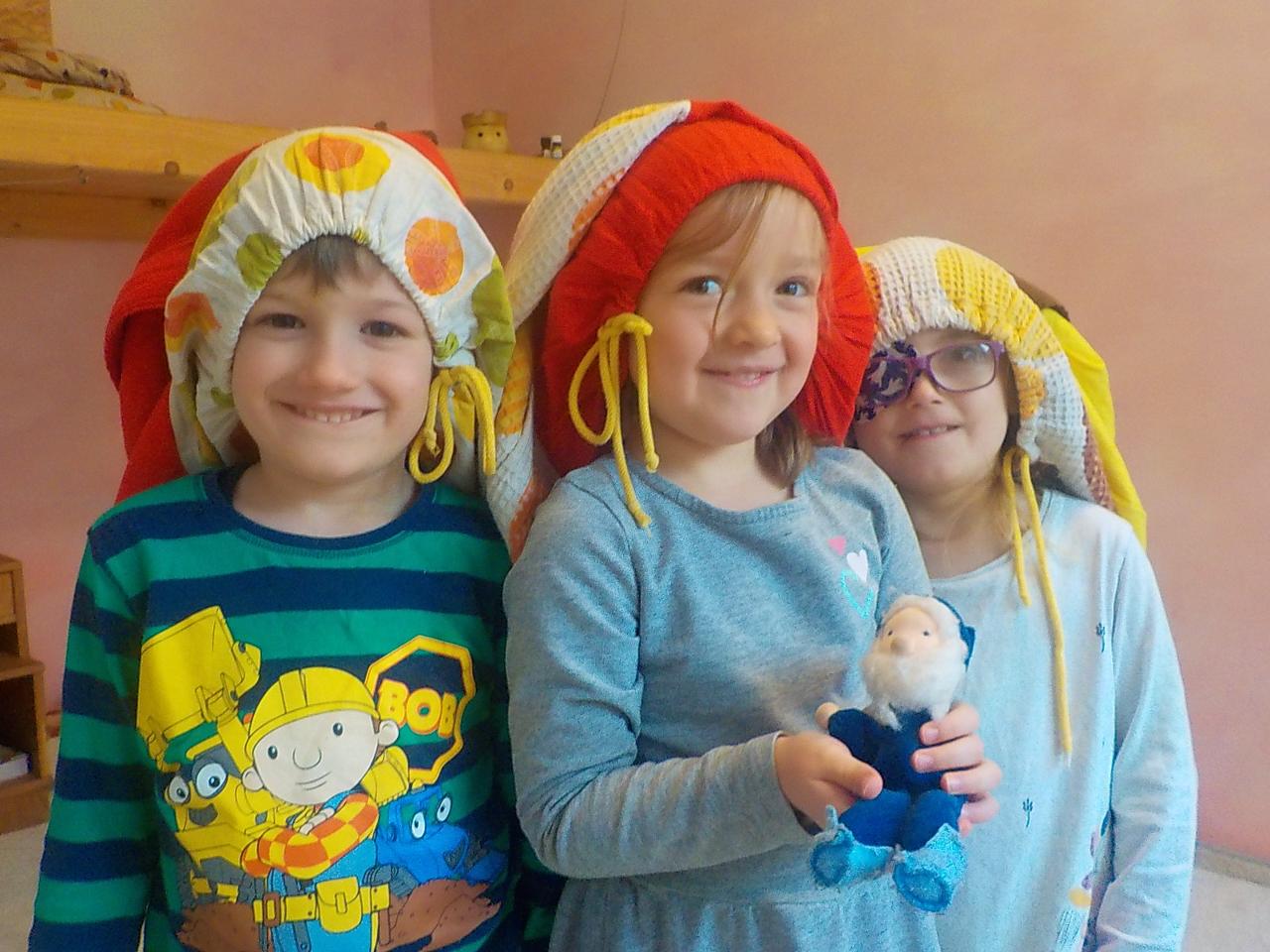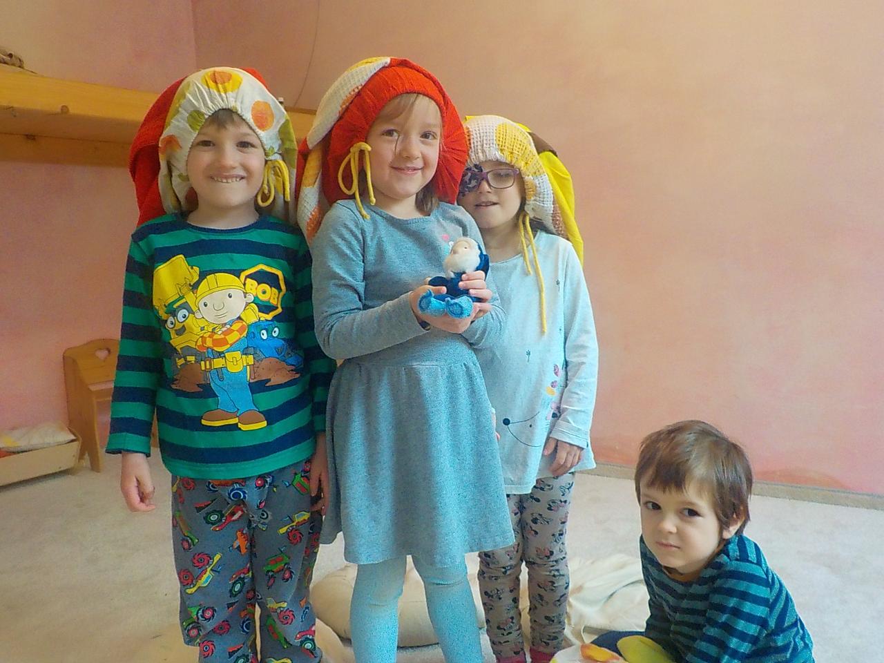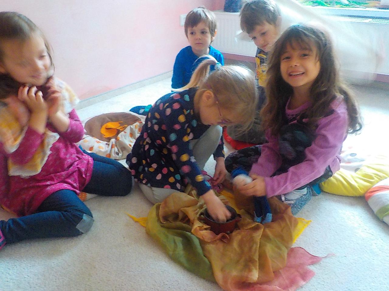 Skřítci byly naším hlavním tématem, jejich práce před zimou, návrat ke kořenům, zazimování - a nejen skřítků, ale i jiných zimních spáčů. Pozorovali jsme stromy, jak usínají, listí na zemi dělá teplou peřinku, síla stromů mizí a projeví se opět na jaře. Vše už chce svůj klid. Prohlíželi jsme, jak to vypadá mezi kořeny, pozorovali jsme vývraty stromů. Péťa potěšila děti divadýlkem, při kterém se stávají nejen diváky, ale i herci. Zasmáli jsme se společně při prstových říkankách, trénovali své smysly, vyráběli si skřítky z přírodních materiálů a ušili si každý svého skřítka z plsti a vlny. Tak dobré spaní, milí skřítkové.