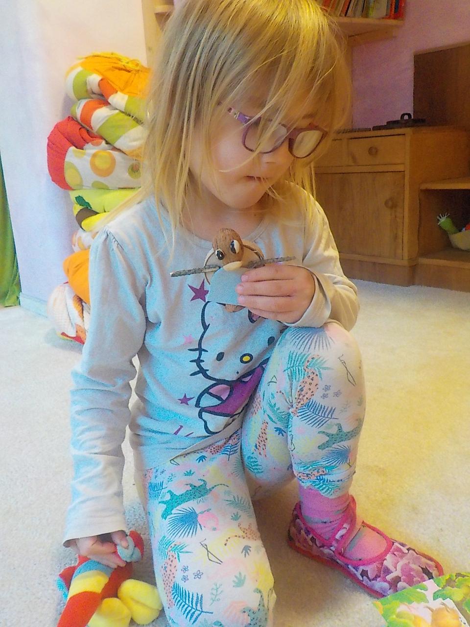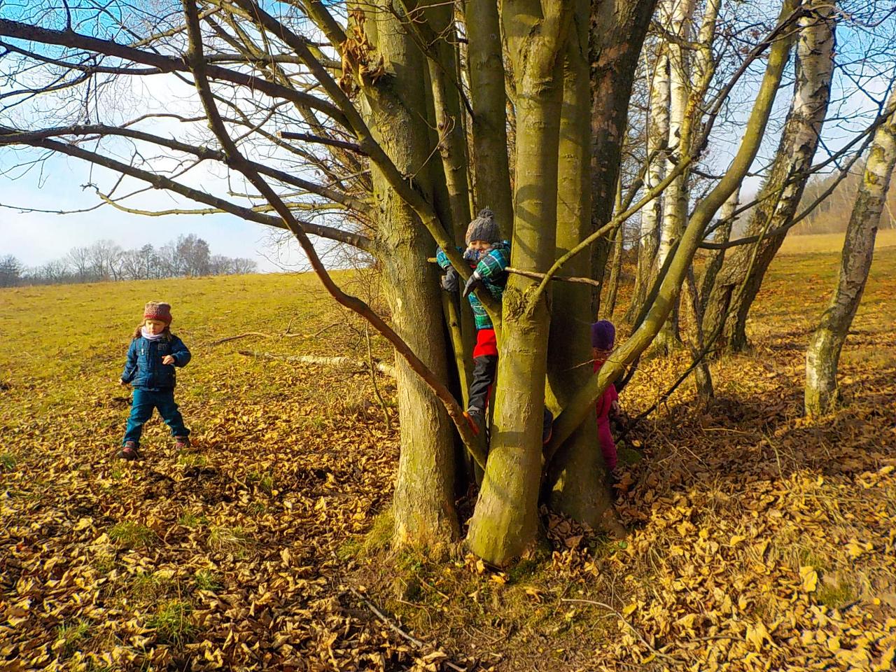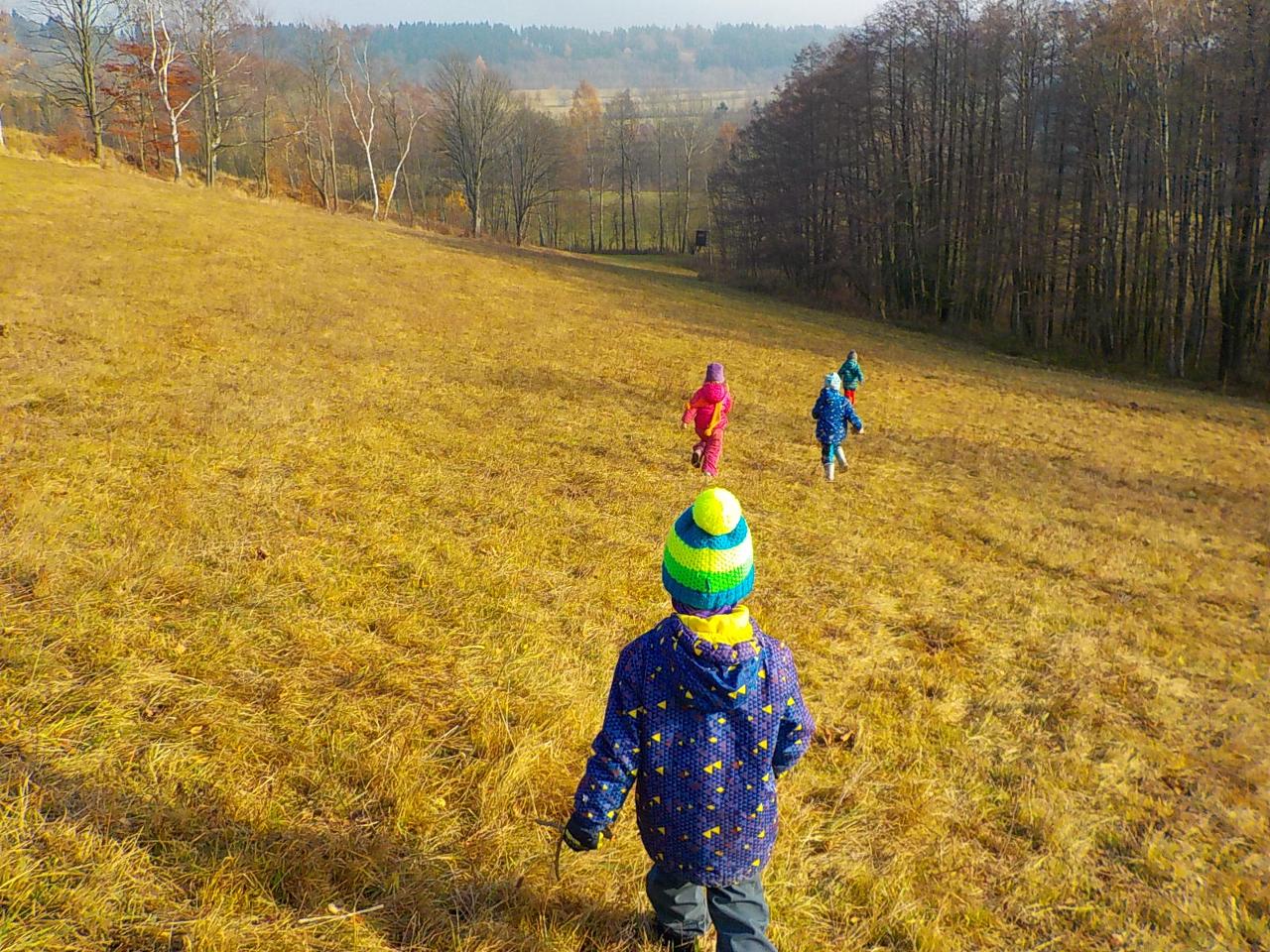Skřítci byly naším hlavním tématem, jejich práce před zimou, návrat ke kořenům, zazimování - a nejen skřítků, ale i jiných zimních spáčů. Pozorovali jsme stromy, jak usínají, listí na zemi dělá teplou peřinku, síla stromů mizí a projeví se opět na jaře. Vše už chce svůj klid. Prohlíželi jsme, jak to vypadá mezi kořeny, pozorovali jsme vývraty stromů. Péťa potěšila děti divadýlkem, při kterém se stávají nejen diváky, ale i herci. Zasmáli jsme se společně při prstových říkankách, trénovali své smysly, vyráběli si skřítky z přírodních materiálů a ušili si každý svého skřítka z plsti a vlny. Tak dobré spaní, milí skřítkové.