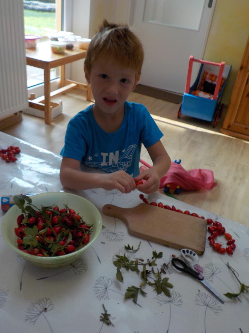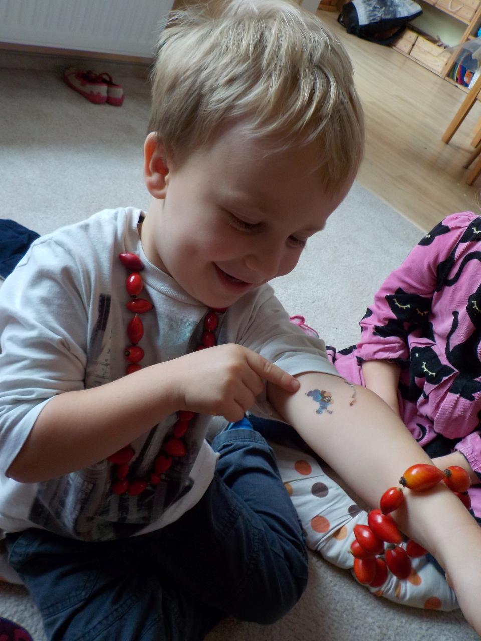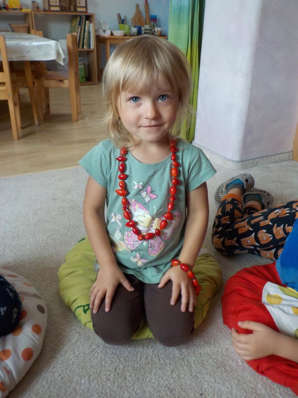 Přestože léto je to tam, všude okolo nás se to červená a kulatí - šípky (z nich pak mohou vznikat takové dobroty jako je šípková marmeláda a čaj, a pro krásu a ozdobu i šípkové korále a náramky), jeřabinky (ty jsme letos vůbec nikde nenašli, alespoň pohádku jsme si o nich pověděli), kaštánky (první z nich už začínají padat na zem, krásně se vyloupnou z pichlavého obalu a uvnitř jsou tak hlaďounké - vyrobili jsme si z nich ježečky a trochu si s nimi pohráli), makovice (o nich známe pěknou písničku a taneček, vyzkoušeli jsme, jaká malá a dobrá zrnka uvnitř skrývají. Užíváme si poslední teplé dny, kdy se můžeme rozběhnout po louce jen tak v triku.