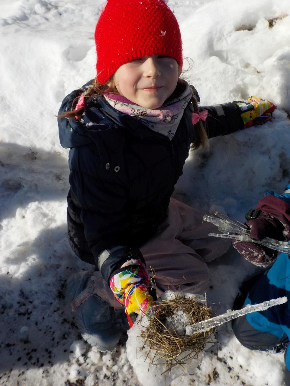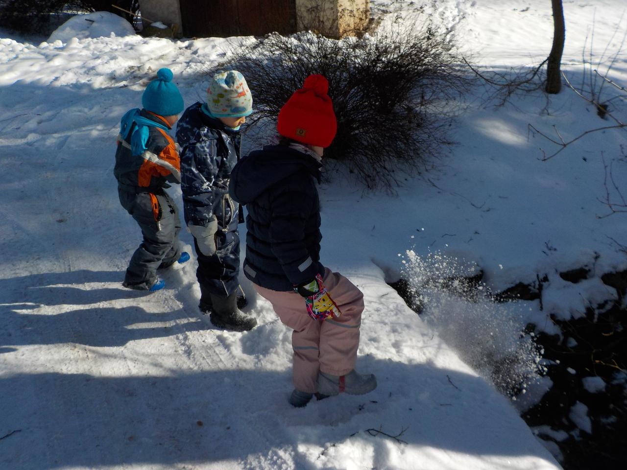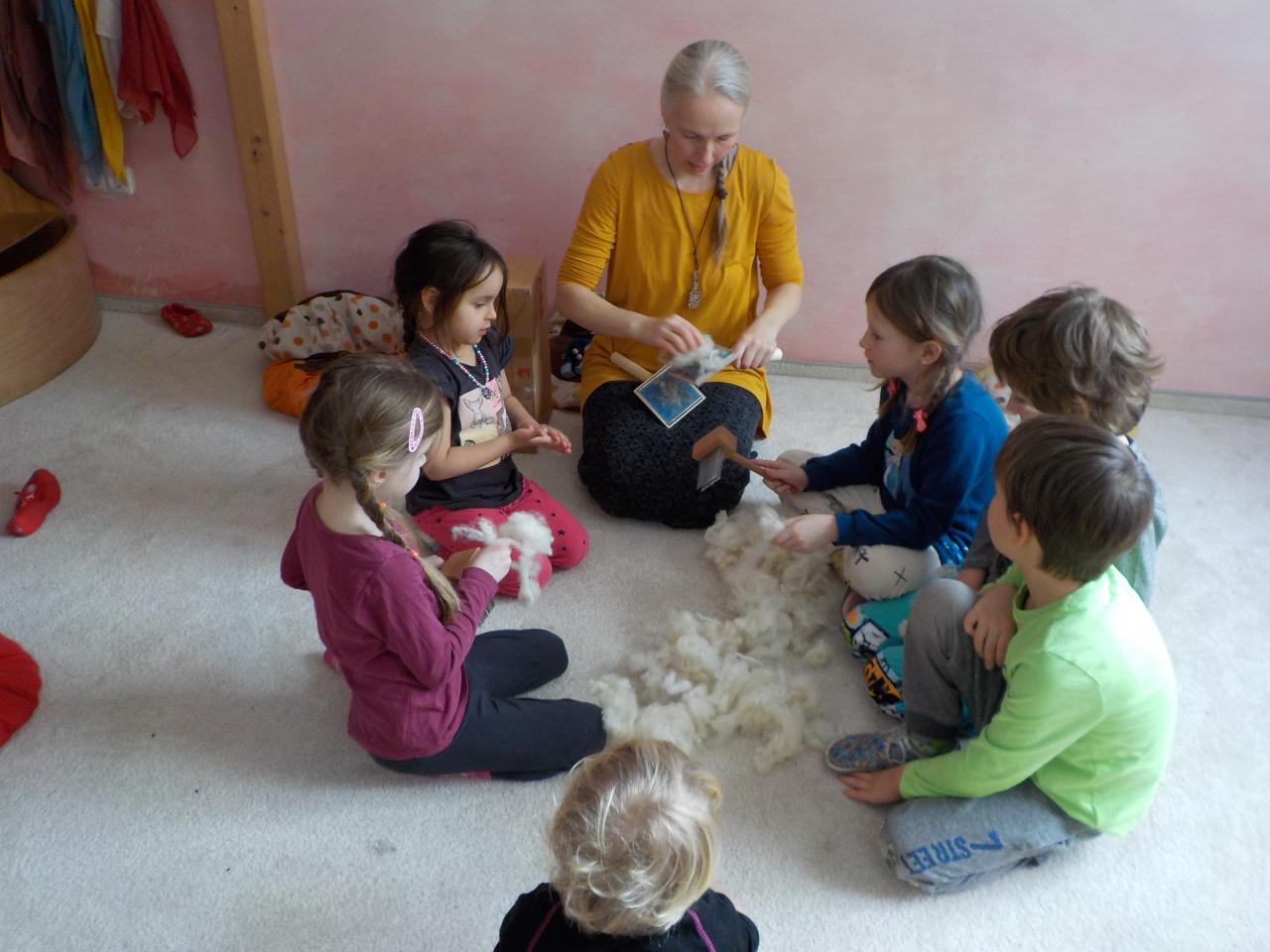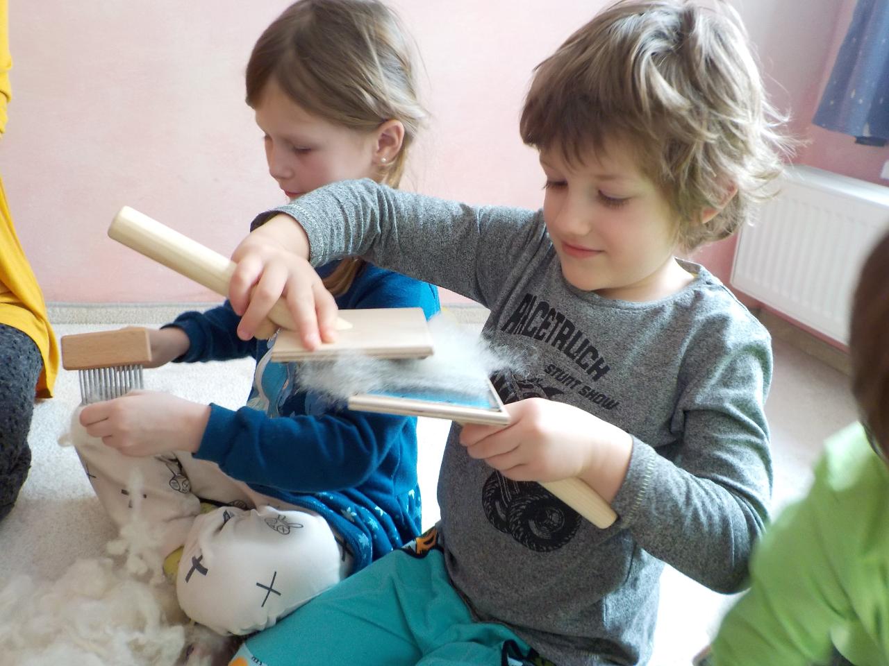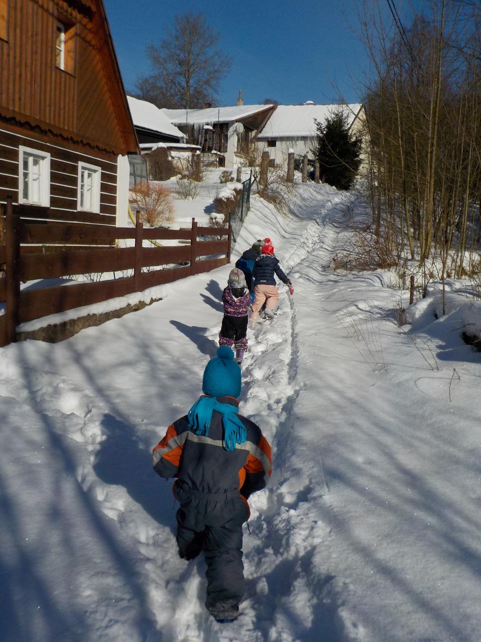 Sněhové a mrazivé dny jsou kouzelné, vzduch tak svěží, sníh jako stříbrné třpytky na slunci, rampouchy a ledové království v potoce. Krom všech tech krás jsou tu naše děti, opět jako pilní pracovníčci - trpělivě tlučou do ledu, aby objevili kapku vody, pravidelně trénují předškolácké úkoly, které se stupňují svou obtížností. Ve školce jsme si s velkou oblibou hráli na všechna řemesla, která nás jen napadala, někdy bylo těžké určit, jaké práci se věnují rodiče. A stejně jako v pohádce jsme si vyzkoušeli práci s ovčí vlnou - nejprve jsme ji učesali a pak na vřetánku upředli nitku. Ještě se máme co učit, ale malý kousek si každý odnesl domů. Uprostřed týdne jsme si zahráli na pekaře a napekli nadýchané houstičky. Velmi rádi si všichni kreslí a někteří nás k tomu doprovází na hudební nástroje.