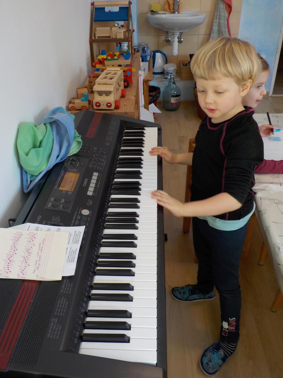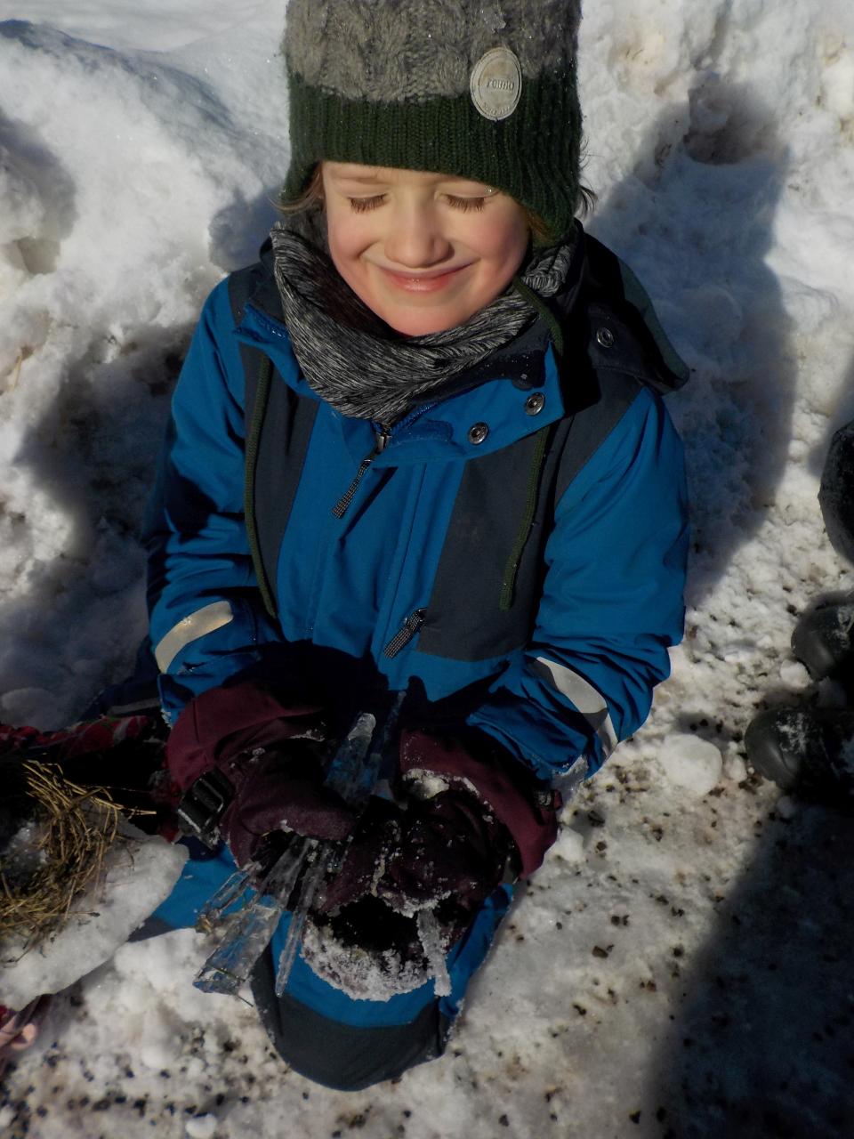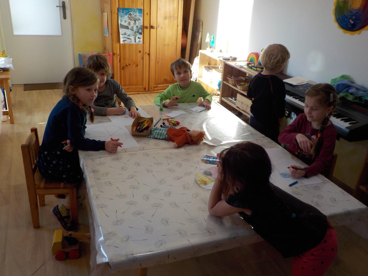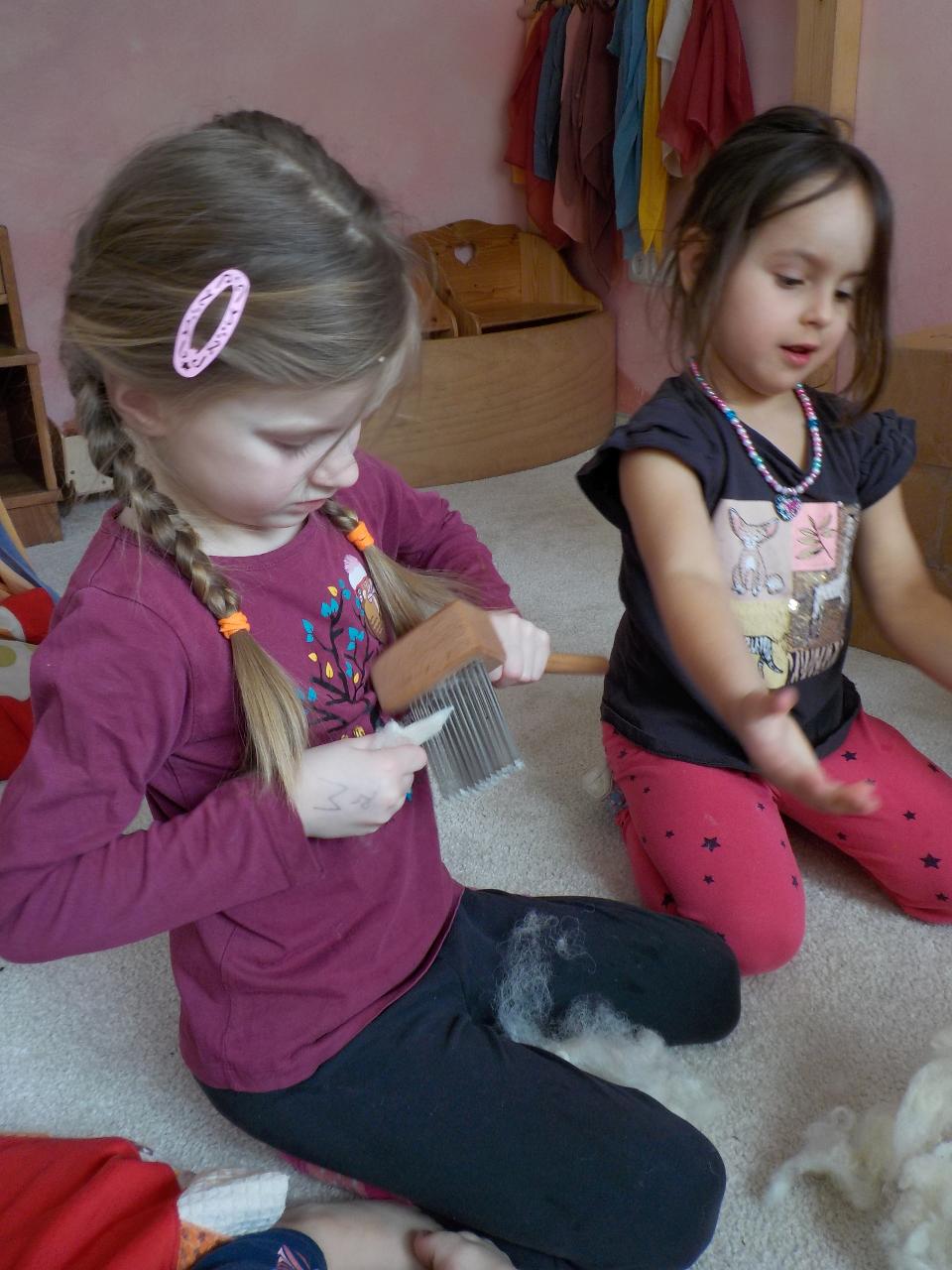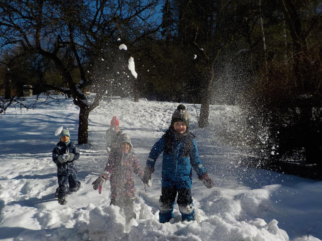 Sněhové a mrazivé dny jsou kouzelné, vzduch tak svěží, sníh jako stříbrné třpytky na slunci, rampouchy a ledové království v potoce. Krom všech tech krás jsou tu naše děti, opět jako pilní pracovníčci - trpělivě tlučou do ledu, aby objevili kapku vody, pravidelně trénují předškolácké úkoly, které se stupňují svou obtížností. Ve školce jsme si s velkou oblibou hráli na všechna řemesla, která nás jen napadala, někdy bylo těžké určit, jaké práci se věnují rodiče. A stejně jako v pohádce jsme si vyzkoušeli práci s ovčí vlnou - nejprve jsme ji učesali a pak na vřetánku upředli nitku. Ještě se máme co učit, ale malý kousek si každý odnesl domů. Uprostřed týdne jsme si zahráli na pekaře a napekli nadýchané houstičky. Velmi rádi si všichni kreslí a někteří nás k tomu doprovází na hudební nástroje.