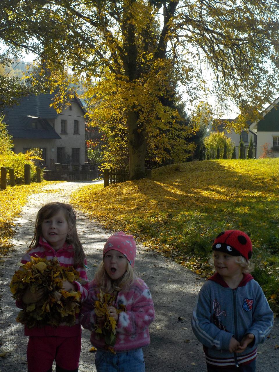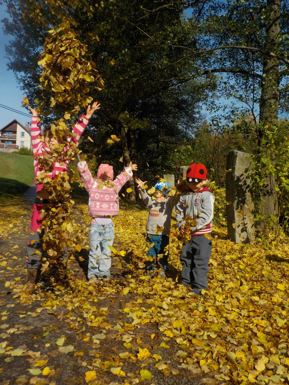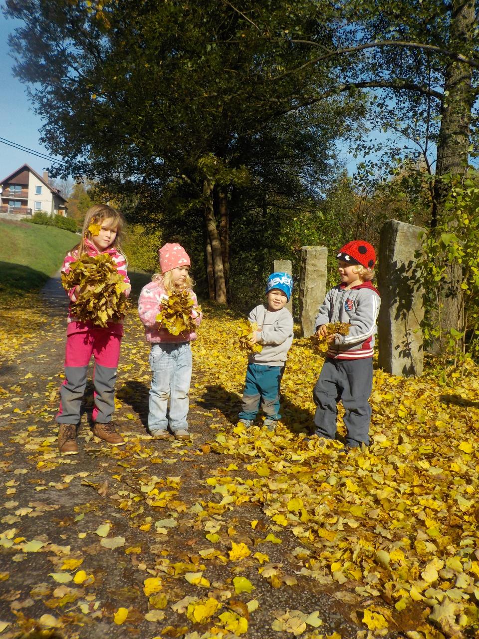 Tento týden nám počasí opravdu přálo. Podzim byl přenádherně vybarvený, neustále jsme se kochali - někdy barvami, jindy zvuky šistícího listí, pak zase jeho lehkostí, když ho vyhodíme a ono se na nás snáší, padajícími listy a vrtulkami, když zafouká vítr. Ani tento týden jsme nezapomněli na malování, modelování, tvoření a místo pečení bylo vaření - vyrobili jsme si jablečnou přesnídávku. Úžasné jsou hry dětí, když se ponoří do své fantazie a využijí, co příroda nebo prostor Mravenečka nabízí. Zdatní jsou též hrabači v písku a hlíně, lezci na stromy. Ani chvilku se společně nenudíme.