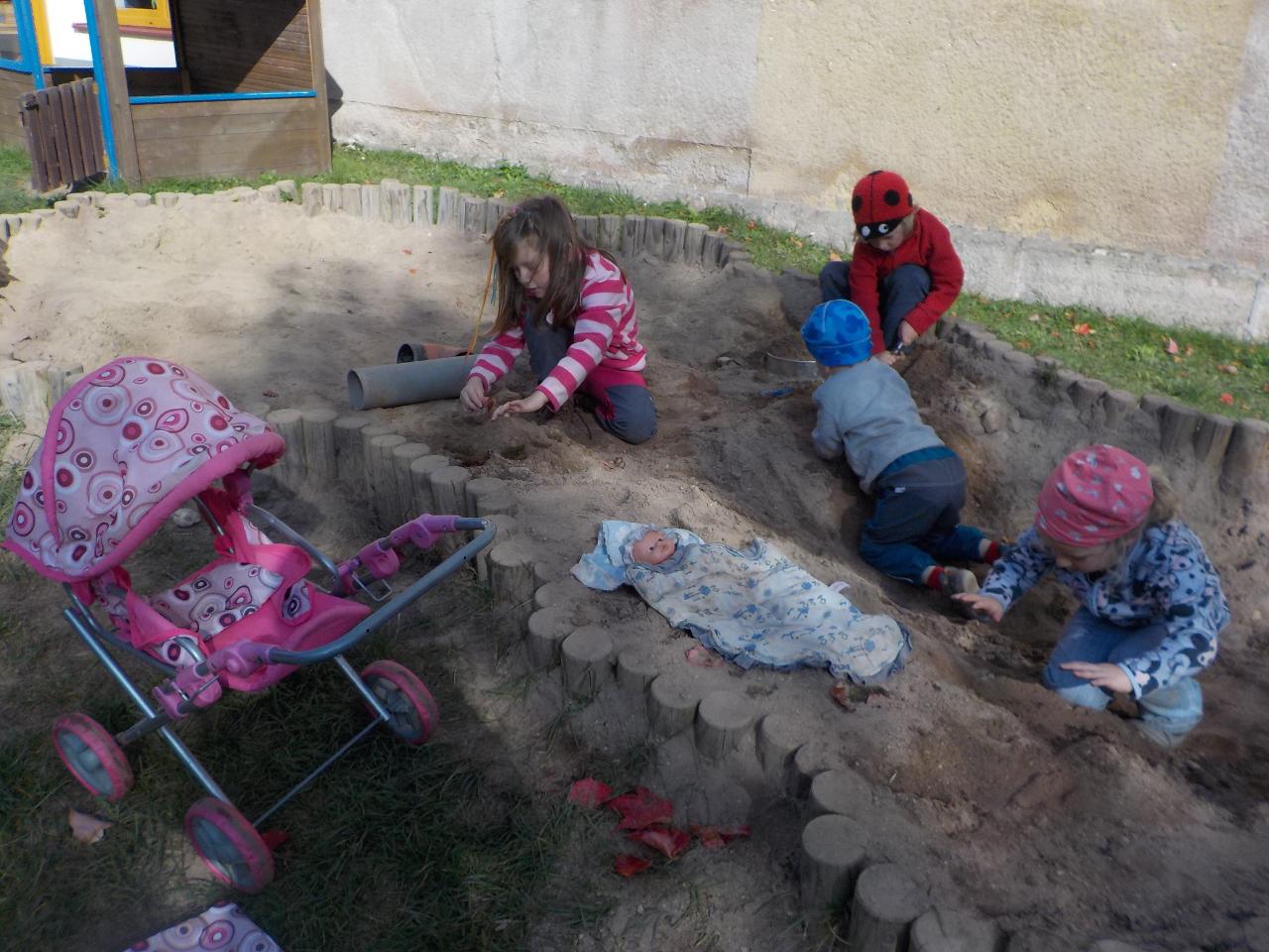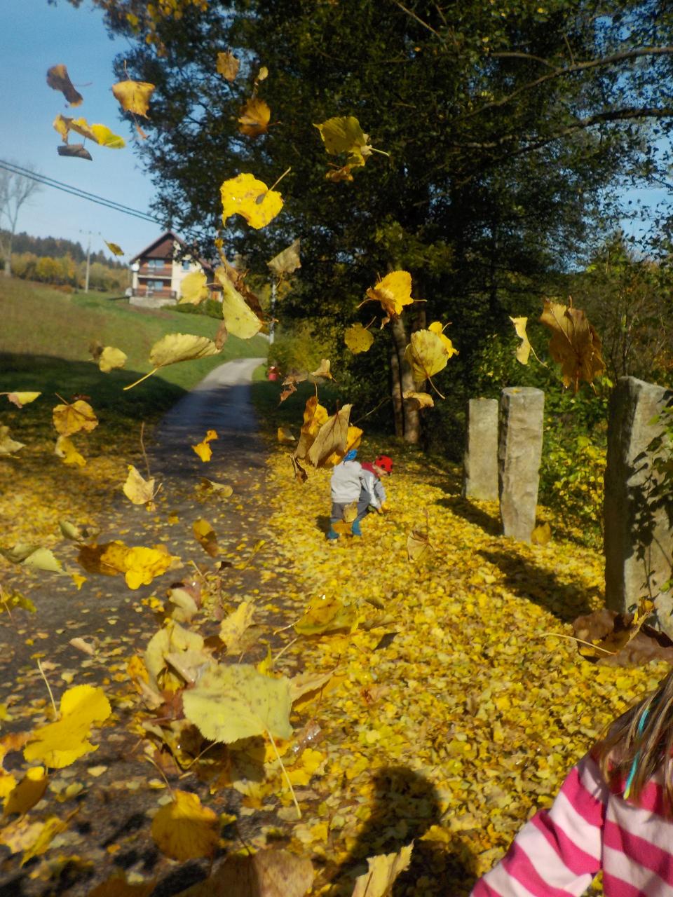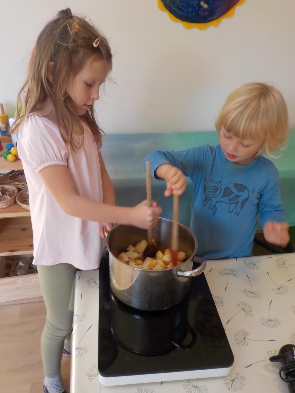 Tento týden nám počasí opravdu přálo. Podzim byl přenádherně vybarvený, neustále jsme se kochali - někdy barvami, jindy zvuky šistícího listí, pak zase jeho lehkostí, když ho vyhodíme a ono se na nás snáší, padajícími listy a vrtulkami, když zafouká vítr. Ani tento týden jsme nezapomněli na malování, modelování, tvoření a místo pečení bylo vaření - vyrobili jsme si jablečnou přesnídávku. Úžasné jsou hry dětí, když se ponoří do své fantazie a využijí, co příroda nebo prostor Mravenečka nabízí. Zdatní jsou též hrabači v písku a hlíně, lezci na stromy. Ani chvilku se společně nenudíme.